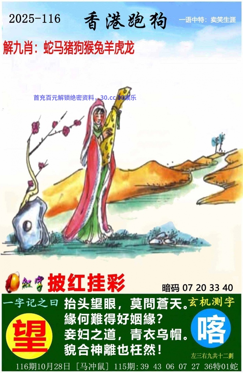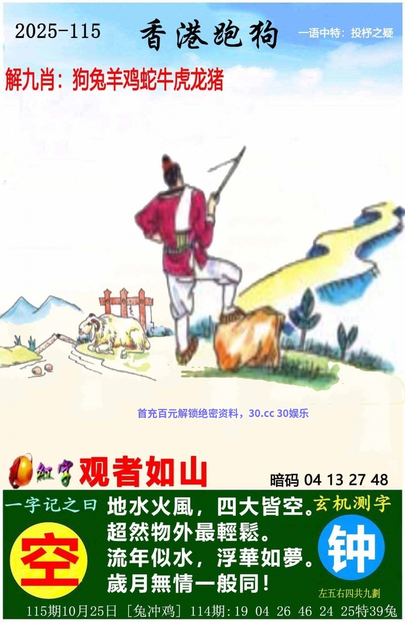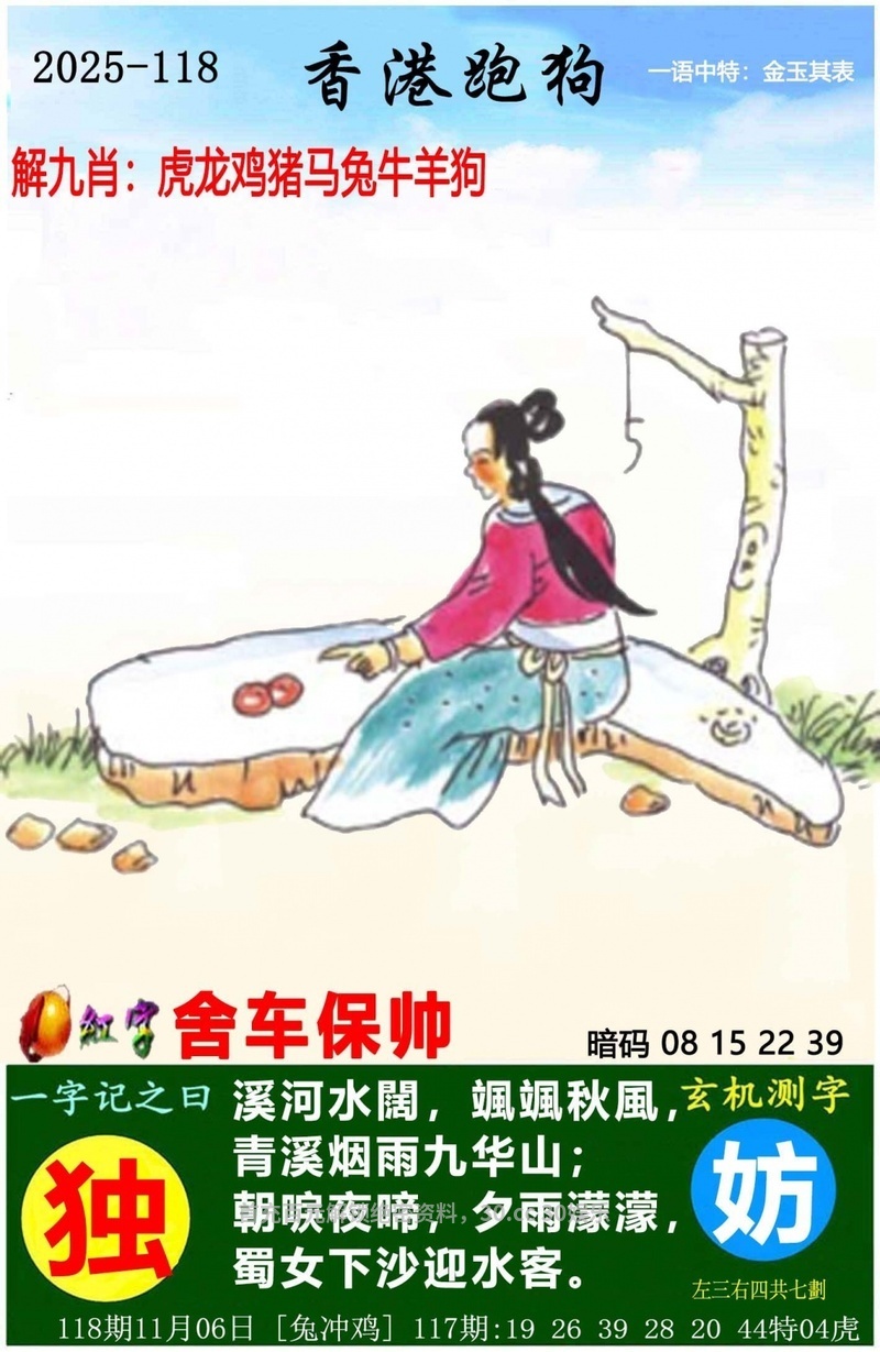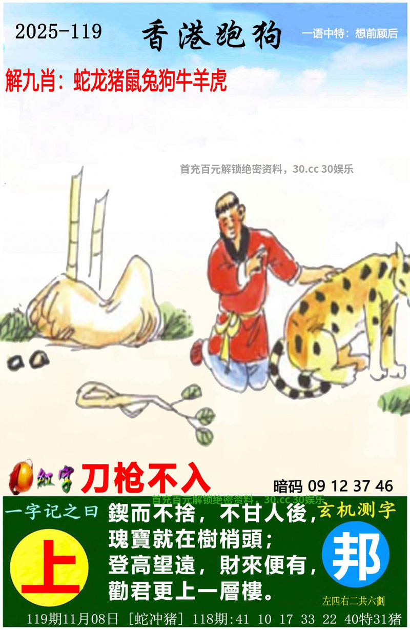 新版跑狗诗 119期:新版跑狗一字記之曰【上】 登高望遠,財來便有, 勸君更上一層樓。 玄機測字:《邦》 一語中特:想前顾后 老版跑狗诗 119期老版跑狗一字記之曰:【石】 詩雲:修生长遣百神灵,谁识三生杜牧之 瑟瑟缩缩,自时苦吃,發達需尋踏腳石; 跋涉长途,成功咫尺,不禁石首岸头风。 玄機測字:《拈》 另版跑狗诗 119期另版跑狗一字記之曰:【鬥】 假想敵,惡到極。張牙舞爪來攻擊。 對著幹,擺架式。嚴陣以待鬥耐力。 红字暗码 119期信箱红字:刀枪不入 信箱暗码:09 12 37 46 |